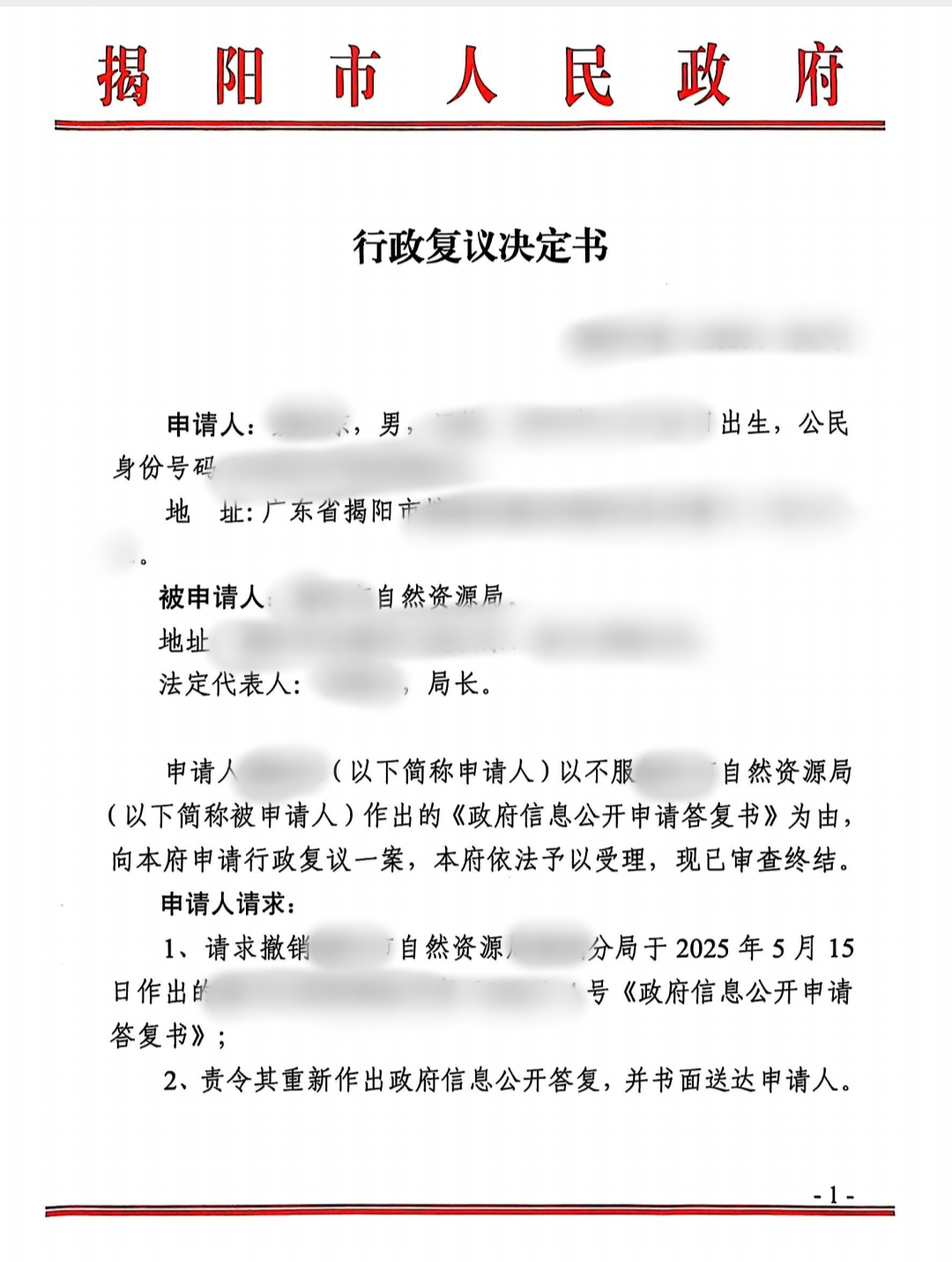 揭阳市人民政府作出行政复议决定,明确认定:“申请人申请的信息系指向于行政机关在征收过程中具体关于两处涉案房产制作或获取的土地调查资料,与不动产登记查询所指向的不动产登记资料存在明显区别”。