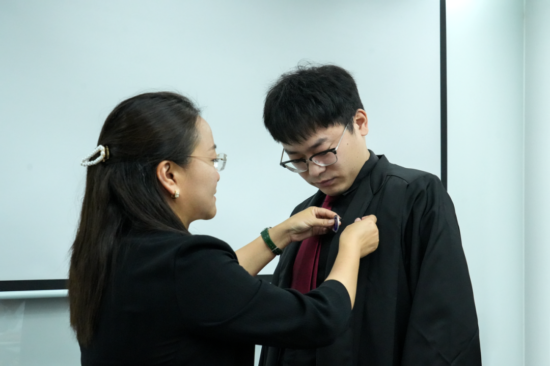 会议的高潮——核心盛典“薪火传承”隆重开启。李利主任亲自为新晋执业律师郭嘉旭授袍,并细心地为其正衣、整理衣领领带,这一系列充满仪式感的动作,承载着前辈对后辈的殷切期许,象征着法律职业使命从一代法律人手中郑重传递到新一代法律人肩上。专业摄影师用镜头定格下这一意义非凡的瞬间,将这份传承的美好永远留存。