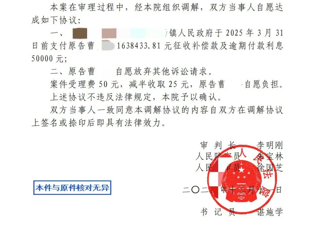 在诉讼过程中,法院组织双方进行了调解,双方自愿就补偿款及利息的支付达成和解,确认由镇政府于2025年3月31日前支付曹先生剩余的1638433.81元征收补偿款,并支付逾期付款利息50000元。