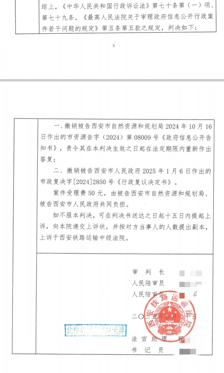 法院采纳代理律师观点,作出判决:对信息公开答复和复议决定一并撤销,并责令西安市自规局在法定期限内重新答复。