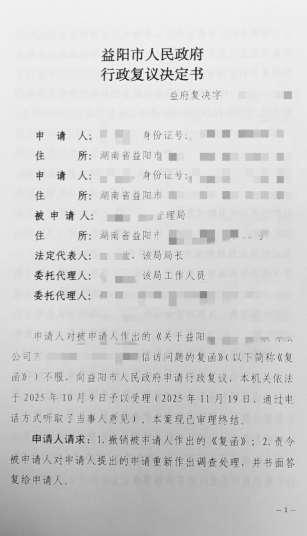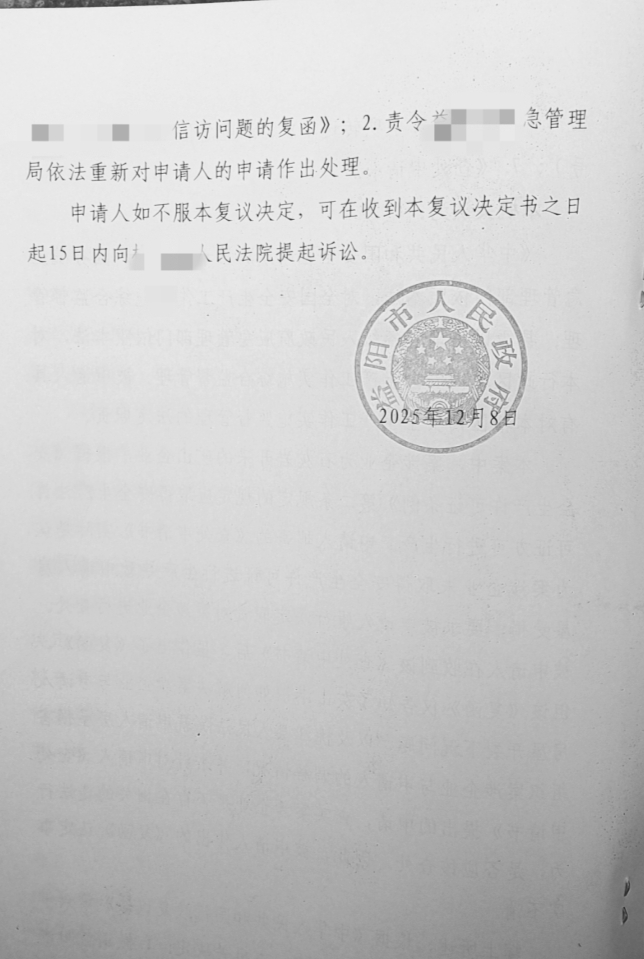 正义终不缺席,2025年12月8日,益阳市人民政府作出复议决定,采纳了可安律师代理意见,撤销了益阳市应急管理局作出的《复函》,并责令其依法重新对申请人的查处申请作出处理。